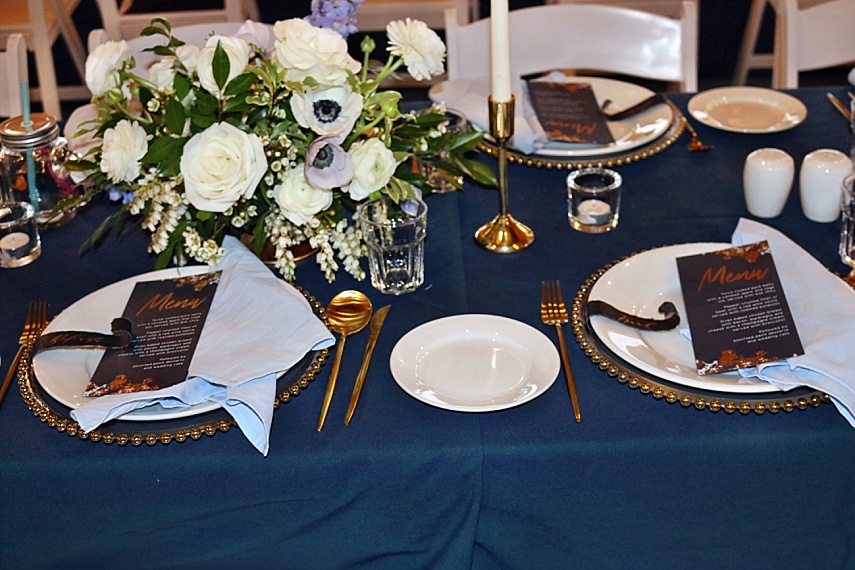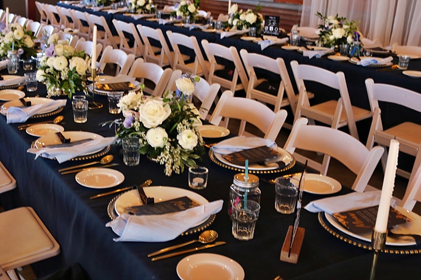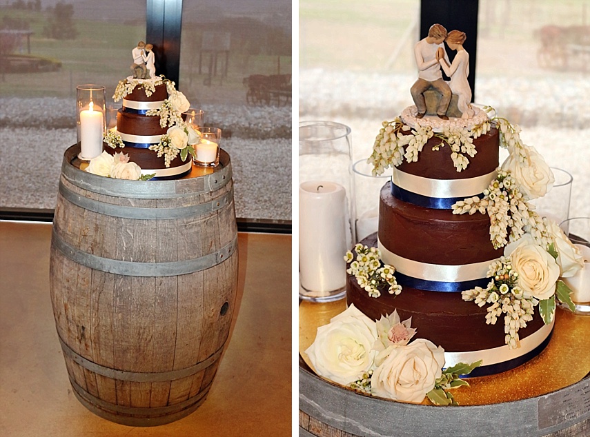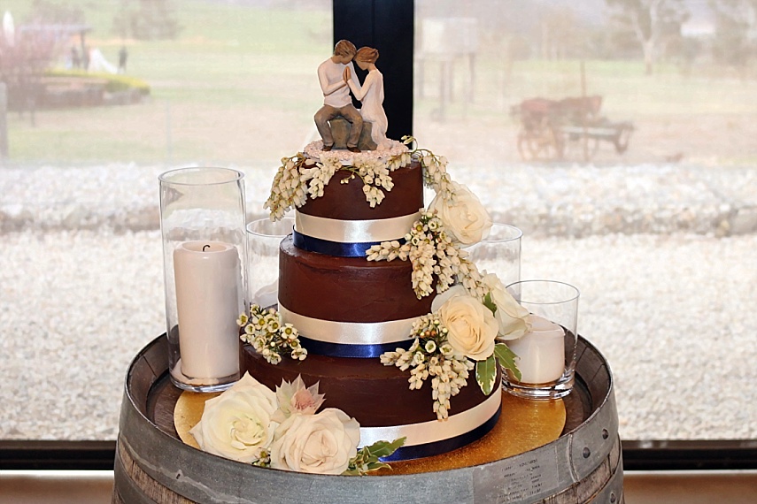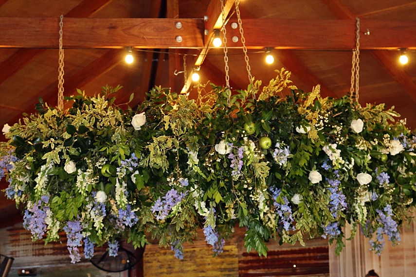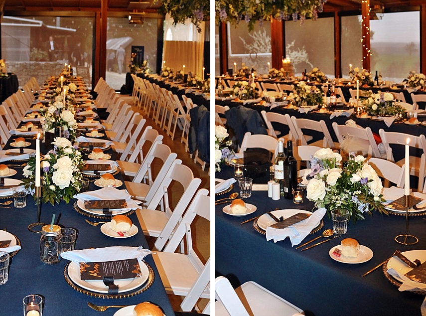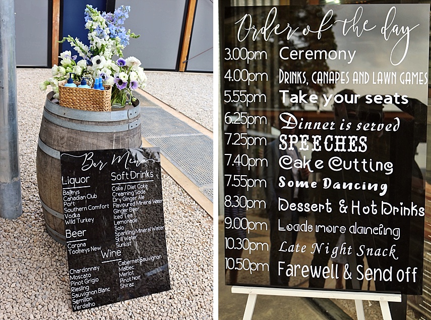 Guests availed themselves to canapes, drinks, lawn games and enjoying the surrounds whilst the kids had a little play area set up for them inside the Barn area at Seclusion’s. As the sun started to set a little chill started to fill the air and guests were invited to take their seats inside the warm Pavilion. The Pavilion had been exquisitely decorated and styled by the lovely team from Wild Blue Studio with an amazing hanging arrangement, fresh flowers, gold cutlery – just so much detail had gone into the look of the room! Also taking pride and place in the Pavilion was the beautiful wedding cake by Josophans.