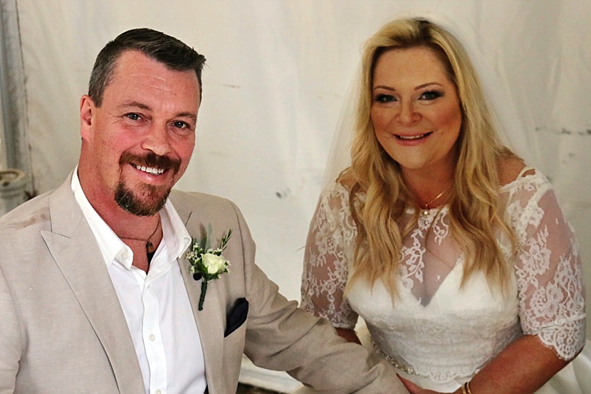 Shane was part way through his vows when a few drops started falling. Tania followed with her vows as some umbrella’s were dispensed to the wedding party and guests as the rain increased slightly. Tania finished her vows then the ring ceremony followed. A reading by Juliette before Tania and Shane were declared husband and wife by Civil Marriage Celebrant, Margaret Phillips to loud applause! Their first kiss as a married couple ensued. The rain drops intensified slightly, so a quick relocation for the Register signing and Mr & Mrs Shane & Tania Phillips were now official and ready for their together forever!! Now some may look upon the little rain towards the end of the ceremony as ruining it, but having gotten to know Tania and Shane and how deep their love is for each other, I saw it as a blessing from the powers above that this love will continue to grow and enrich not only their own lives, but also that of all those whom they come into contact with.