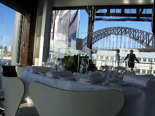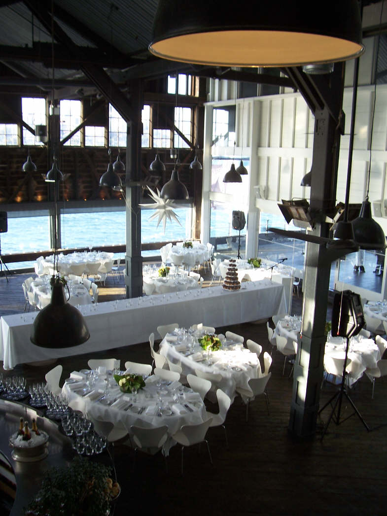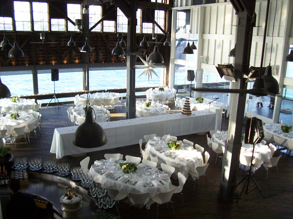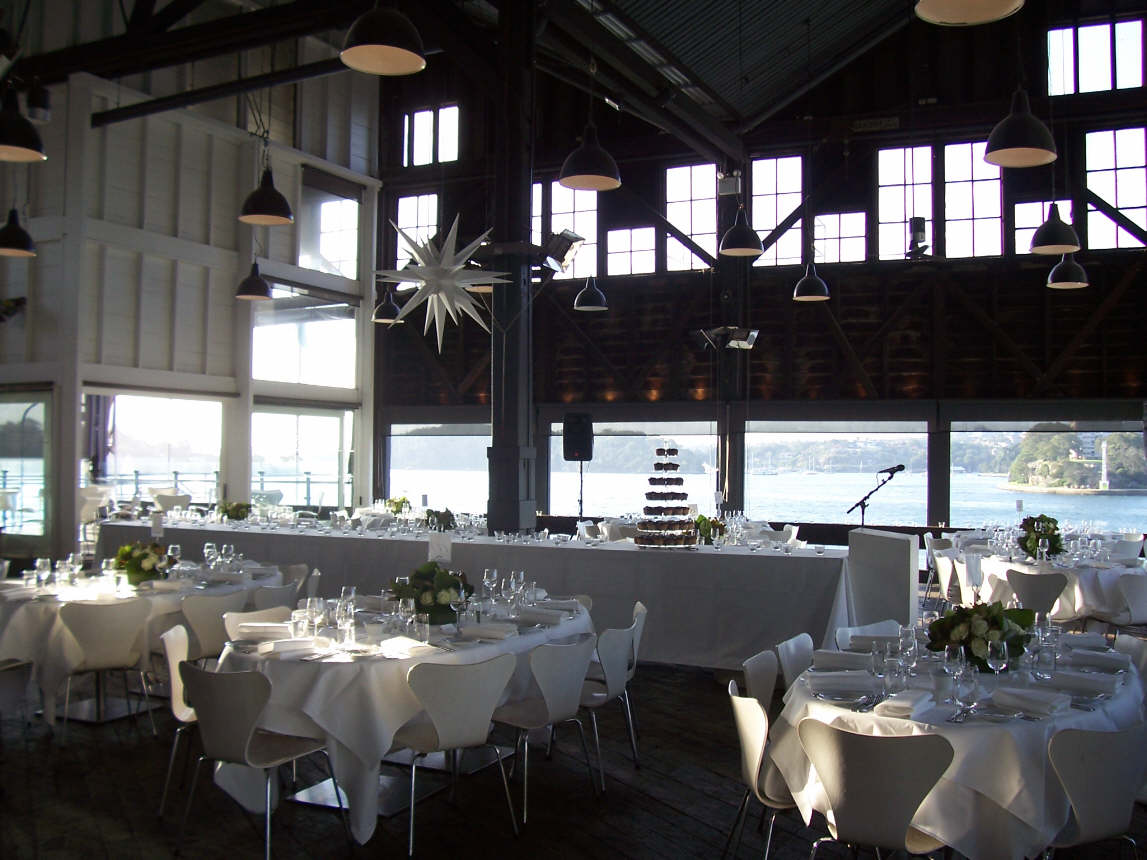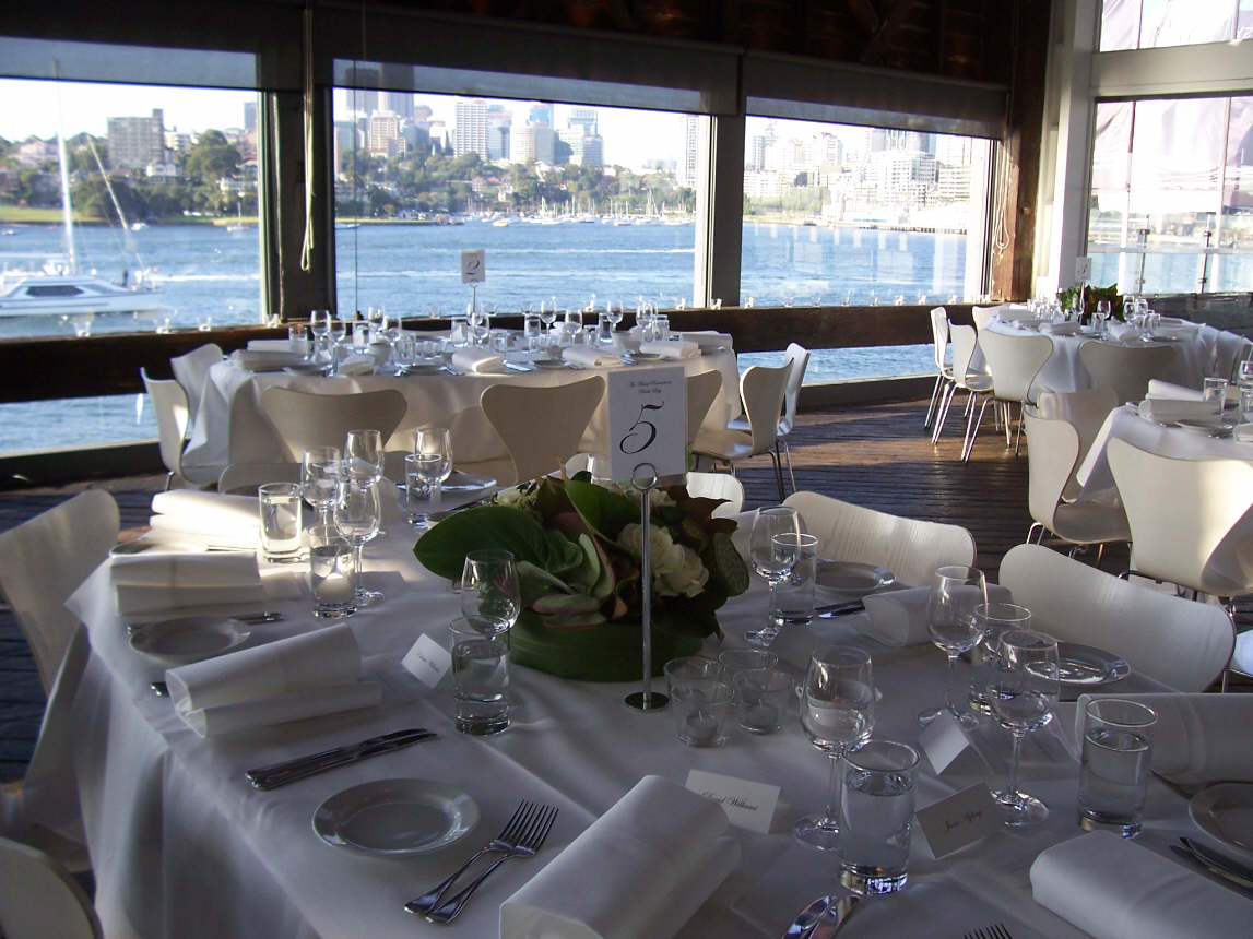 Reception for 115 guests held at the The Wharf Restaurant, Walsh Bay. The restaurant is housed at the end of a renovated timber finger wharf which is also home to the Sydney Theatre Company and Sydney Dance Company. During the day the restaurant is flooded with natural light and the views are spectacular. In the evening, the view is equally as impressive with the beautiful night lights of the Harbour Bridge, Luna Park and the North Sydney skyline.